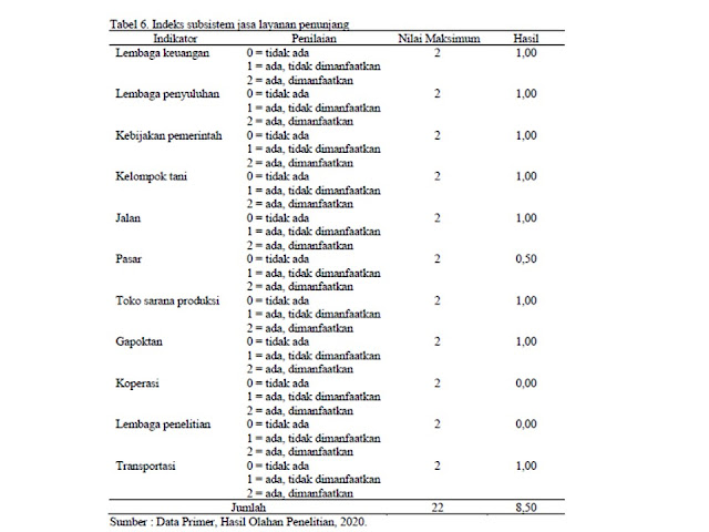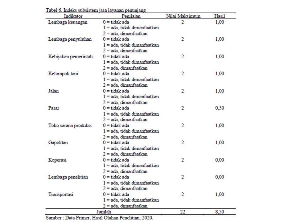 Indeks agribisnis subsistem penyediaan sarana produksi menggunakan 15 indikator. Indeks sistem agribisnis subsistem usahatani menggunakan 20 indikator. Indeks sistem agribisnis subsistem pengolahan menggunakan 6 indikator. Indeks sistem agribisnis subsistem pemasaran menggunakan 16 indikator. Indeks sistem agribisnis subsistem peranan jasa layanan penunjang menggunakan 11 indikator, yaitu lembaga keuangan (bank), lembaga penyuluhan, kebijakan pemerintah, kelompok tani, jalan, pasar, toko sarana produksi, gapoktan, koperasi, lembaga penelitian, dan transportasi.
