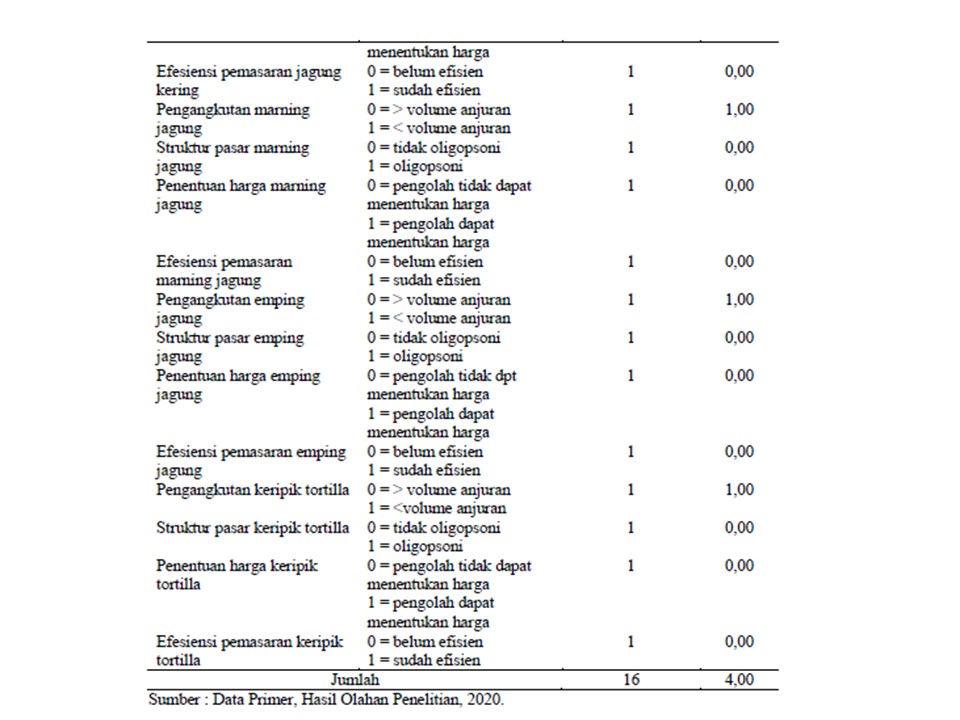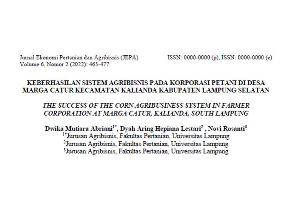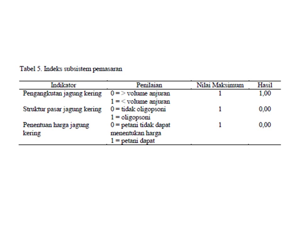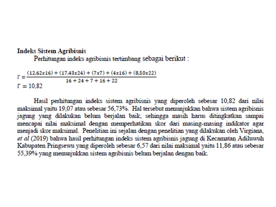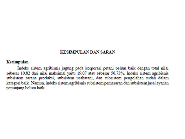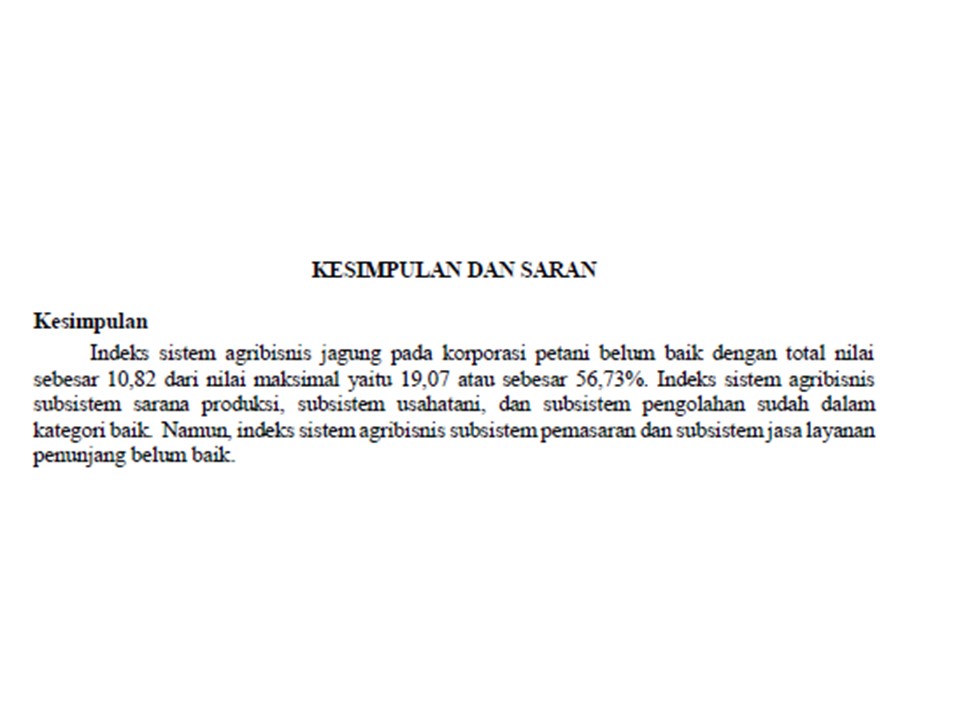 Indeks sistem agribisnis jagung pada korporasi petani belum baik dengan total nilai sebesar 10,82 dari nilai maksimal yaitu 19,07 atau sebesar 56,73%. Indeks sistem agribisnis subsistem sarana produksi, subsistem usahatani, dan subsistem pengolahan sudah dalam kategori baik. Namun, indeks sistem agribisnis subsistem pemasaran dan subsistem jasa layanan penunjang belum baik.